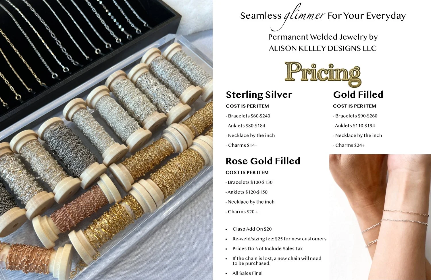 Treat yourself or a loved one with a special experience. We permanently weld custom fit chains into bracelets, anklets, and necklaces, so you can wear them all the time. Choose from Sterling Silver, Gold Filled, Rose Gold Filled and 14k gold chains.